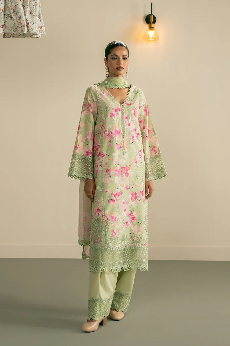 Effortlessly elegant and crafted for summer days, this ensemble stuns with a digitally printed and delicately embroidered lawn shirt, adorned with organza patches and borders for that extra flair. A flowing chiffon dupatta brings a breezy charm, while the dyed cotton trousers promise comfort without compromising style. your go-to look for staying chic in the heat.